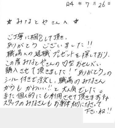 ご丁寧に梱包して頂き、ありがとうございました!!職場への退職プレゼントを探しており、この度みなとやさんの♡型おせんべい購入させて頂きました!「ありがとう」のシール付きで注文し、職場のみなさんからもかわいい!!と大人気でした。また個人的にも利用させて頂きます。スタッフのみなさんもお身体大切になさって下さいね!!