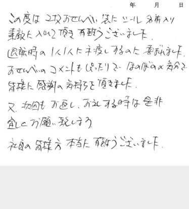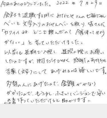 この度は2枚おせんべい袋にシール名前入り素敵に入れて頂き有難うございました。退職時の1人1人に手渡しするのに喜ばれました。おせんべいのコメントもぴったりでほのぼの気分で皆様に感謝の気持ちを頂きました。又、次回もお返し、お礼する時は是非よろしくお願い致します。社員の皆様方本当に有難うございました。