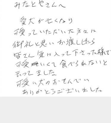 愛犬が亡くなり可愛がっていただいた方々に御礼と思いお渡ししたら皆さん気に入って下さった様で可愛くて食べられないと云ってました。可愛い犬のおせんべいありがとうございました。