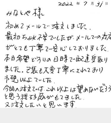 初めてメールで注文しました。最初ちょっと不安でしたが、メールでの対応がとても丁寧で安心しておりました。本日希望どうりの日時まで配達受取りました。包装も大変丁寧にされており予想以上でした。今回の注文では、これ以上は望めないだろうと思う程好感がもてました。又注文したいと思います。