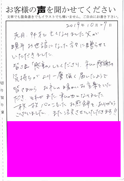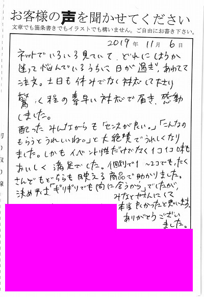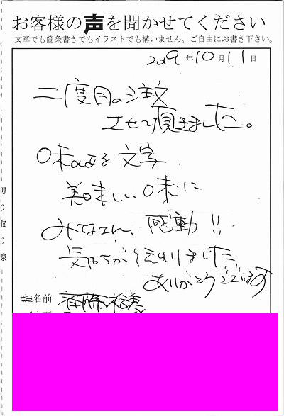 二度目の注文させて頂きました。味のある文字、美味しい味に皆さん感動!!気もちが伝わりました。ありがとうございます。