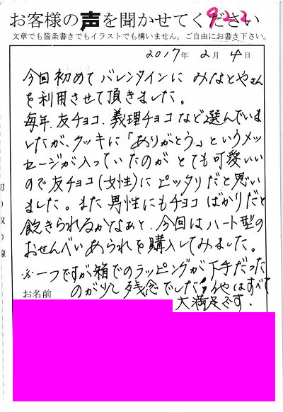 バレンタインデーギフトにご利用のお客様の声 9 『バレンタインにみなとやさんを利用させて頂きました』