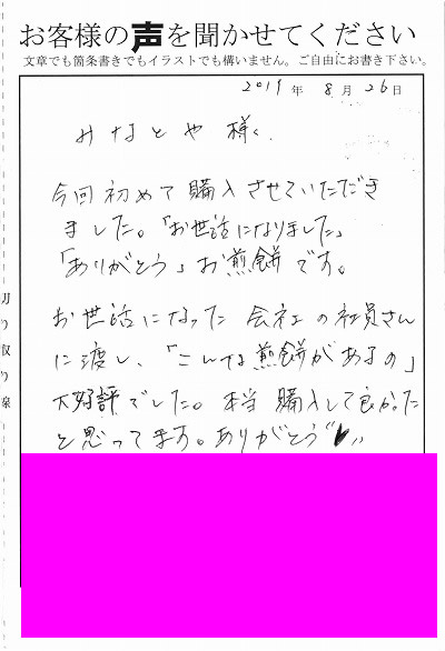 今回初めて購入させていただきました。「おせわになりました」「ありがとう」お煎餅です。お世話になった会社の社員さんに渡し、「こんな煎餅があるの」大好評でした。本当購入して良かったと思っています。ありがとう♡