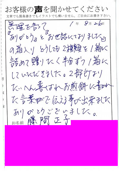 無理を言って「ありがとう」と「お世話になりました」の箱入り、どうしても2種類を1箱に詰めて贈りたく半分ずつ1箱にしていただきました。2部所よりたいへん喜ばれお煎餅に書かれた言葉で伝える事が出来ました。ありがとうございました。