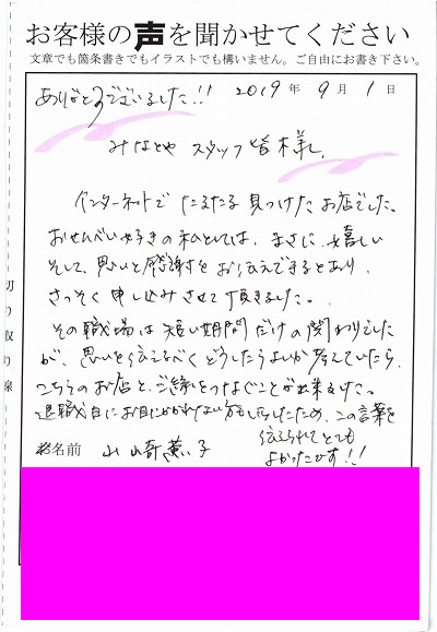 ありがとうございました!!みなとやスタッフ皆さま。インターネットでたまたま見つけたお店でした。おせんべい好きの私としては、まさに嬉しいそして、想いと感謝をお伝えできるとあり、さっそく申し込みさせていただきました。その職場は短い期間だけの関わりでしたが、思いを伝えるべくどうしたらよいか考えていたら、こちらのお店と、ご縁をつなぐことが出来ました。退職日にお目にかかれない方もいらしたため、この言葉を伝えられてとてもよかったです!!