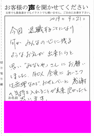 今回退職することになり何かみんなの心に残るような、お礼が出来たらとおもい「みなとや」さんにお願いしました。160人全員にあいさつは無理なので、おせんべいに感謝の気持ちを入れることが出来て良かったとおもいます。