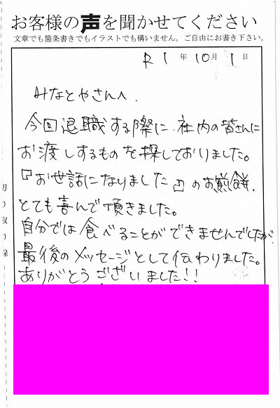 退職あいさつのお客様の声 116 『「お世話になりました」のお煎餅、とても喜んで頂きました。』