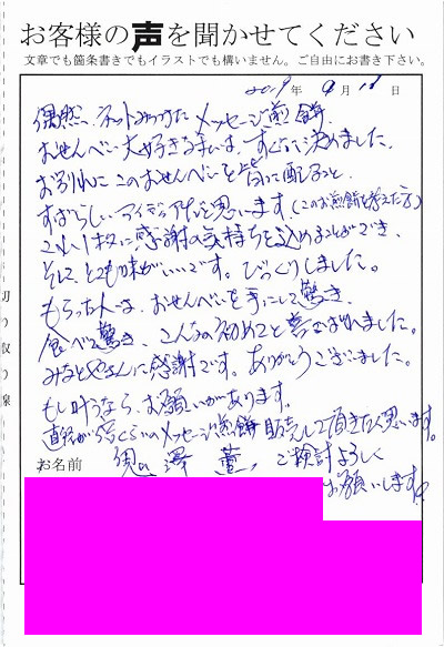 偶然、ネットみつけたメッセージ煎餅。おせんべい大好きな私は、すぐに決めました。お別れにこのせんべいを皆に配ること、ずばらしいアイディアだと思います。(このお煎餅を考えた方)これ1枚に感謝の気持ちを込めることができ、そして、とても味がいいです。びっくりしました。もらった人は、おせんべいを手にして驚き、食べて驚き、こんなの初めてと喜ばれました。みなとやさんに感謝です。ありがとうございました。もし叶うならお願いがあります。直径が倍くらいのメッセージ煎餅販売して頂きたく思います。ご検討よろしくお願いします!