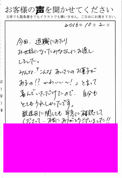 今回退職にあたりお世話になったみなさんにお渡ししました。みんな「こんなあいさつのお菓子があるの!?かわいい~!」と言って喜んでいただけたので、自分もとてもうれしかったです。配送日に関しても早急に確認してくださって本当にありがとうございました!!