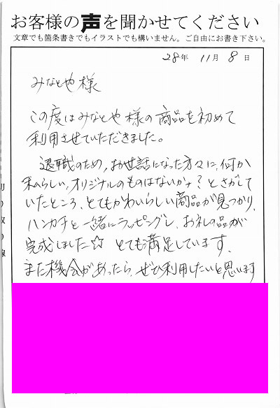 この度はみなとや様の商品を初めて利用させていただきました。退職のため、お世話になった方々に何か私らしいオリジナルのものはないかな?とさがしていたところとてもかわいらしい商品が見つかりハンカチと一緒にラッピングし、お礼の品が完成しました。とても満足しています。また機会があったらぜひ利用したいと思います。