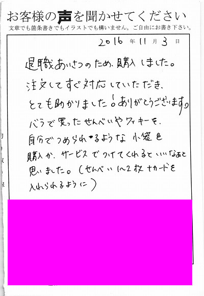 退職あいさつのために購入しました。注文してすぐ対応していただきとても助かりました!ありがとうございます。バラで買ったせんべいやクッキーを自分でつめられるような小袋を購入かサービスでつけてくれるといいなあと思いました。(せんべい1~2枚+カードを入れられるように)