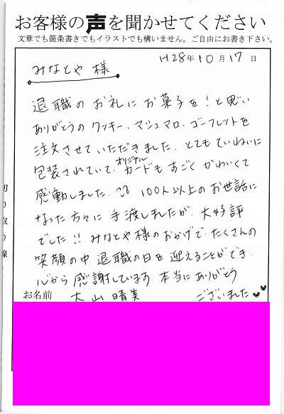 退職のお礼にお菓子を!と思いありがとうのクッキー、マシュマロ、ゴーフレットを注文させていただきました。とてもていねいに包装されていてオリジナルカードもすごくかわいくて感動しました。100人以上のお世話になった方々に手渡ししましたが大好評でした!!みなとや様のおかげでたくさんの笑顔の中、退職の日を迎えることができ、心から感謝しています。本当にありがとうございました。