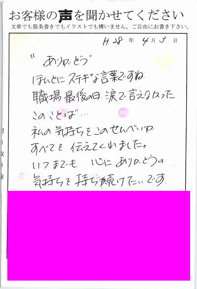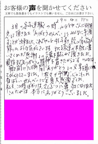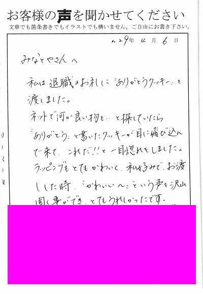 退職あいさつのお客様の声 75 『”かわいい~”という声を沢山聞くことができ、とてもうれしかったです』