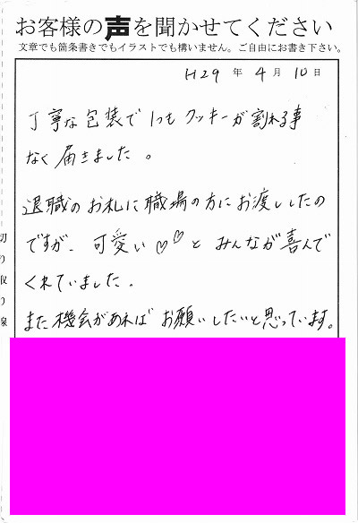 丁寧な包装で1つでもクッキーが割れる事なく届きました。退職のお礼に職場の方にお渡ししたのですが、可愛いとみんなが喜んでくれていました。また機会があればお願いしたいと思っています。