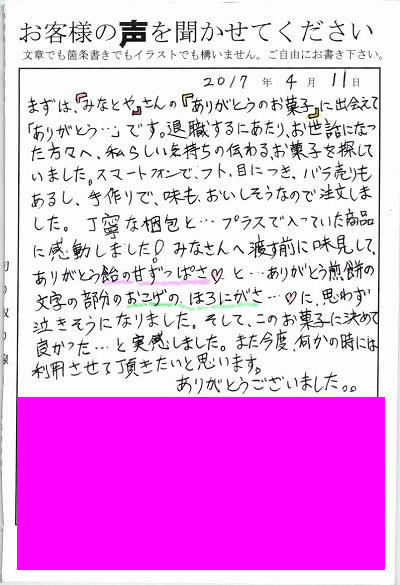 まずは『みなとや」さんの『ありがとうのお菓子』に出会えて「ありがとう・・・」です。退職するにあたり、お世話になった方々へ私らしい気持ちの伝わるお菓子を探していました。スマートフォンでフト目につき、バラ売りもあるし、手作りで味もおいしそうなので注文しました。丁寧な梱包と・・・プラスで入っていた商品に感動しました!みなさんへ渡す前に味見してありがとう飴の甘酸っぱさと・・・ありがとう煎餅の文字の部分のおこげのほろ苦さ・・・に思わず泣きそうになりました。そして、このお菓子に決めて良かった・・・と実感しました。また今度、何かの時には利用させて頂きたいと思いました。ありがとうございました。