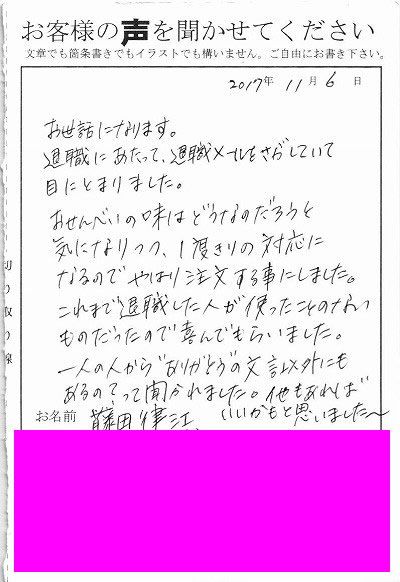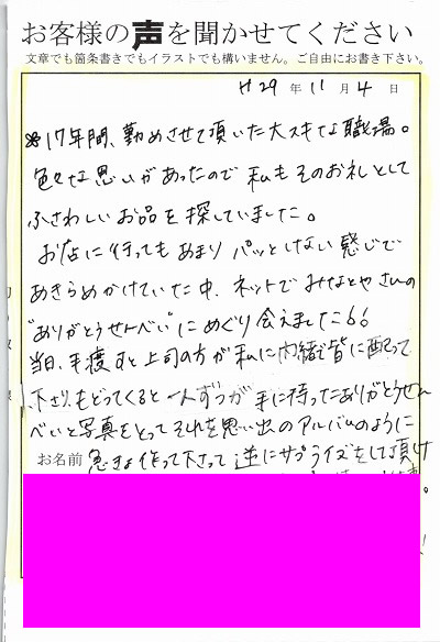 退職あいさつのお客様の声 85『これまで退職した人が使ったことのないものだったので喜んでもらいました』