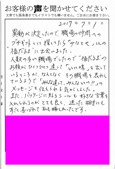 異動が決定したので職場の仲間へのプチギフトとして探していたら「みなとや」さんの福だるまに出会いました。人数の多い職場でしたので福だるまのお顔がひとつひとつ違って「いい味」を出しているところがなんとなくその職場を表しているようで「みんな違って、みんないい!」のメッセージを伝えられる気がしました。また、パッケージに貼るシールも好きな言葉を入れられるのがとても良く、送った相手にもすごく喜ばれてわたしも嬉しかったです。