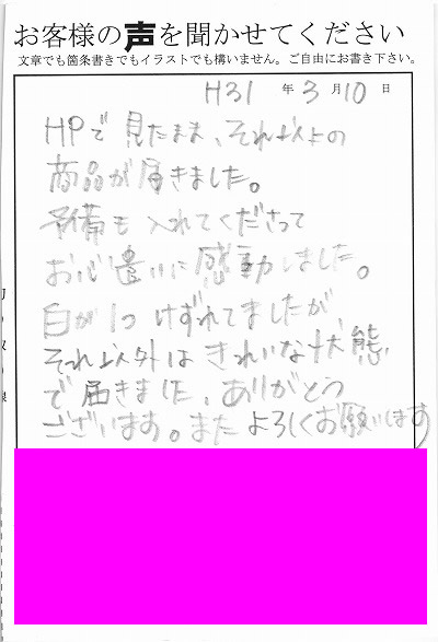 HPで見たままそれ以上の商品が届きました。予備も入れてくださってお心遣いに感動しました。白が1つけずれてましたが、それ以外はきれいな状態で届きました。ありがとうございます。またよろしくお願いします。