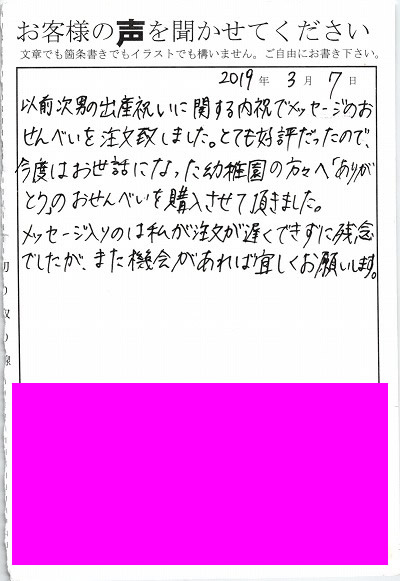 以前、次男の出産祝いに関する内祝でメッセージのおせんべいを注文致しました。とても好評だったので、今度はお世話になった幼稚園の方々へ「ありがとう」のおせんべいを購入させて頂きました。メッセージの入りのは私が注文が遅くできずに残念でしたが、また機会があれば宜しくお願いします。