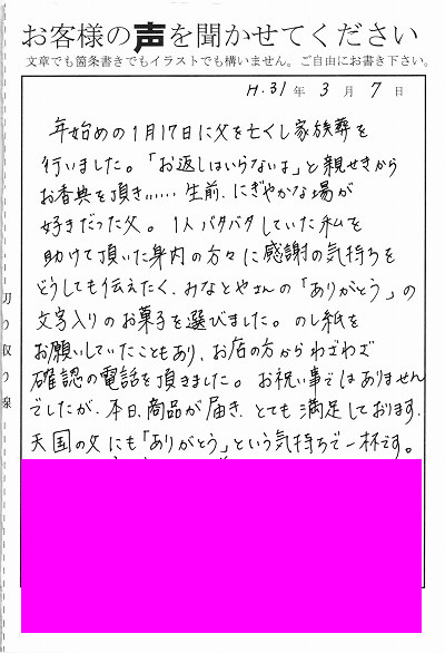 年始めの1月17日に父を亡くし家族祭を行いました。「お返しはいらないよ」と親せきからお香典を頂き・・・生前、にぎやかな場が好きだった父。1人バタバタしていた私を助けて頂いた身内の方々に感謝の気持をどうしても伝えたく、みなとやさんの「ありがとう」の文字入りのお菓子を選びました。のし紙をお願いしていたこともあり、お店の方からわざわざ確認の電話を頂きました。お祝い事ではありませんでしたが、本日商品が届き、とても満足しております。天国の父にも「ありがとう」という気持ちで一杯です。