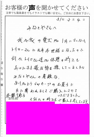 我が家の愛犬が1月に亡くなりトリマーさんに16年お世話になったので何かトリマさん達が休憩の時でもお口にする様な物を探していましたらみなとやさんの素敵なありがとうメッセージのお菓子に目を奪われましてご購入させていただきました。又何かの時でもご購入を考えています。