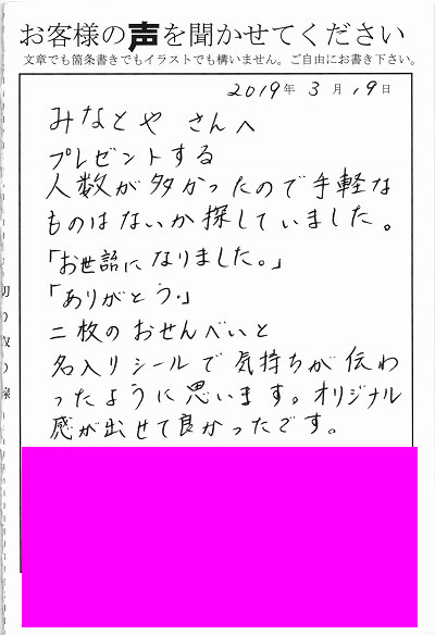 プレゼントする人数が多かったので手軽なものはないか探していました。「お世話になりました」「ありがとう」二枚のおせんべいと名入シールで気持ちが伝わったように思います。オリジナル感が出せて良かったです。