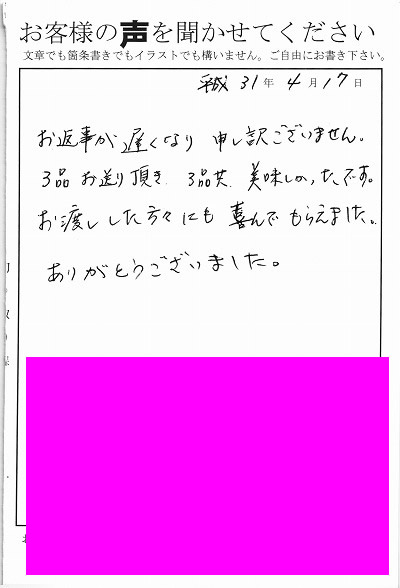 3品お送り頂き、3品共、美味しかったです。お渡しした方々にも喜んでもらえました。ありがとうございました。