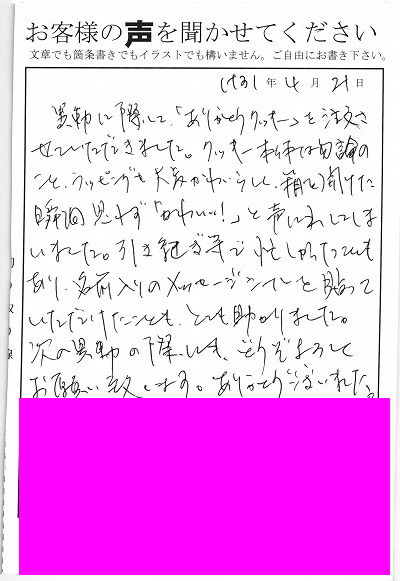移動に際して「ありがとうクッキー」を注文させていただきました。クッキー本体は勿論のことラッピングもたいへんかわいらしく箱を開けた瞬間思わず「かわいい!」と声に出してしまいました。引き継ぎ等で忙しかったこともあり、名前入りメッセージシールを貼っていただけたこともとても助かりました。次の異動の際にもどうぞよろしくお願い致します。ありがとうございました。