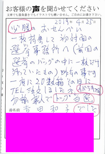 必勝のおせんべい一枚持参して招待面の選挙事務所へ(前回の選挙のバッグの中に一枚だけの残っていたもの)昨年ことです。一度に20数箱その日にTEL注文しました。勿論新人でトップ当選でした。