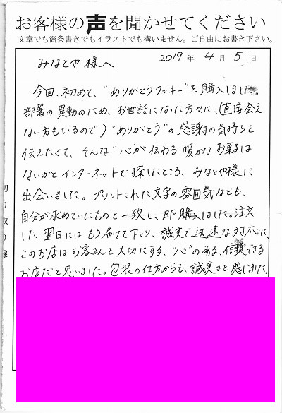 今回、初めて”ありがとうクッキー”を購入しました。部署の異動のため、お世話になった方々に(直接会えない方もいるので)ありがとうの感謝の気持を伝えたくてそんな心が伝わる暖かなお菓子はないかとインターネットで探したところ、みなとや様に出会いました。プリントされた文字の雰囲気なども自分が求めていたものと一致し、即購入しました。注文した翌日にはもう届けて下さり、誠実で迅速な対応にこのお店はお客さんを大切にする心のある信頼できるお店だと思いました。包装の仕方からも誠実さを感じました。