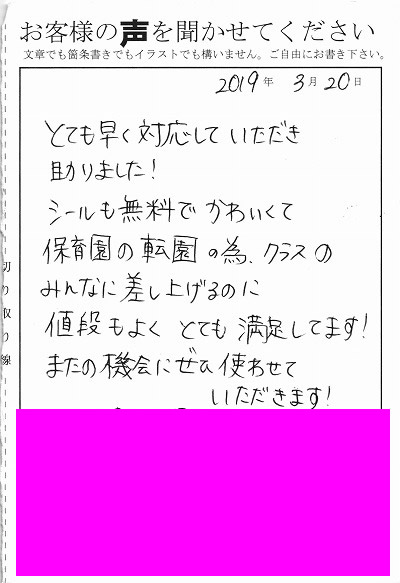 とても早く対応していただき助かりました!シールも無料でかわいくて保育園の転園の為、クラスのもみんなに差し上げるのに、値段もよくとても満足しています!またに機会にぜひ使わせていただきます!