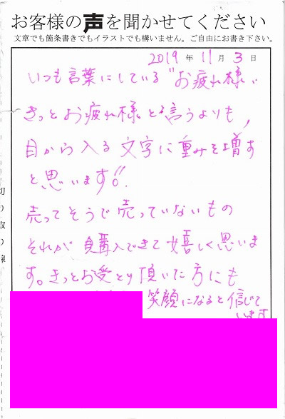 いつも言葉にしている”お疲れさま”きっとお疲れさまと言うよりも、目から入る文字に重みを増すと思います!!売ってそうで売ってないもの。それが購入できて嬉しく思います。きっとお受けとり頂いた方にも笑顔になると信じています。