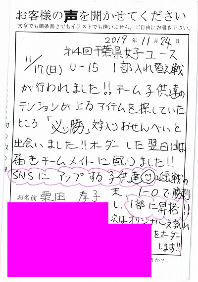 11/17(日)U-151部入れ替え戦が行われました!!チームの子供たちのテンションが上がるアイテムを探していたところ「必勝」文字入りおせんべいと出会いました!!オーダーした翌日には届きチームメイトに配りました!!SNSにアップする子供達(^-^)延長戦の末、1-0で勝利し1部に昇格!!次はオリジナル文字入れをオーダーします!!