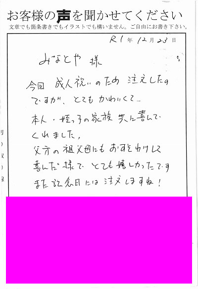 みなとや様 今回成人祝いのため注文したのですが、とてもかわいくて…本人・姪っ子の家族共に喜んでくれました。父方の祖父母にもおすそわけして喜んだ様でとても嬉しかったです。また記念日には注文しますね!