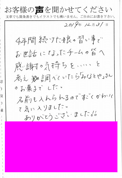 4年間続けた娘の習い事でお世話になったチームの皆へ感謝の気持ちを…と考え調べていたら「みなとや」さんのお菓子でした。名前も入れられるのですごくかわいくて気に入りました。ありがとうございました!!