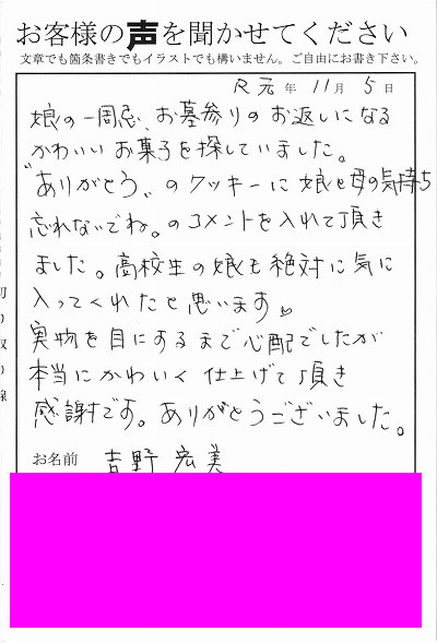 娘の一周忌、お墓参りのお返しになるかわいいお菓子を探していました。“ありがとう”のクッキーに娘と母の気持ちを忘れないでね。のコメントを入れて頂きました。高校生の娘も絶対に気に入ってくれたと思います♡実物を目にするまで心配でしたが、本当にかわいく仕上げて頂き感謝です。ありがとうございました。