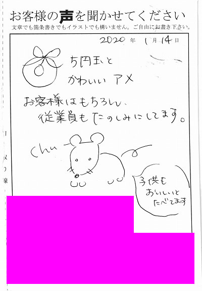 5円玉とかわいいアメ。お客様はもちろん従業員もたのしみにしてます。子供もおいしいとたべています。