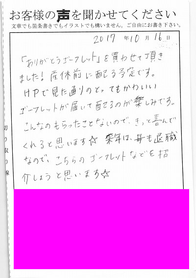 「ありがとうゴーフレット」を買わせて頂きました!産休前に配る予定です。HPで見た通りのとってもかわいいゴーフレットが届いて配るのが楽しみです。こんなのもらったことないので、きっと喜んでくれると思います。来年は母も退職なので、こちらのゴーフレットなどを紹介しようと思います。