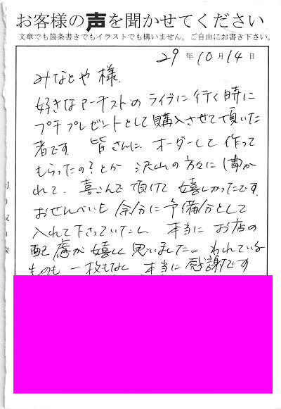 好きなアーティストのライブに行く時にプチプレゼントとして購入させていただいた者です。皆さんにオーダーして作ってもらったの?とか沢山の方々に聞かれて、喜んで頂けて嬉しかったです。おせんべいも余分に予備分として入れてくださっていたし、本当にお店の配慮が嬉しく思いました。われているものも一枚もなく、本当に感謝です。