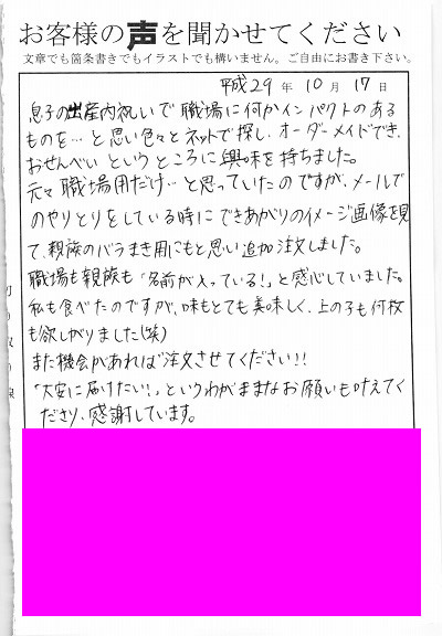 息子の出産内祝いで職場に何かインパクトのあるものを・・・と思いいろいろとネットで探し、オーダーメイドでき、おせんべいという所に興味を持ちました。元々職場用だけ・・・と思っていたのですが、メールでのやりとりをしている時にできあがりのイメージ画像を見て親族のバラまき用にもと思い、追加注文しました。職場も親族も「名前が入っている!」と感心していました。私も食べたのですが、味もとても美味しく上の子も何枚も欲しがりました。また機会があれば注文させてください!!「大安に届けたい!」というわがままなお願いも叶えてくださり、感謝しています。