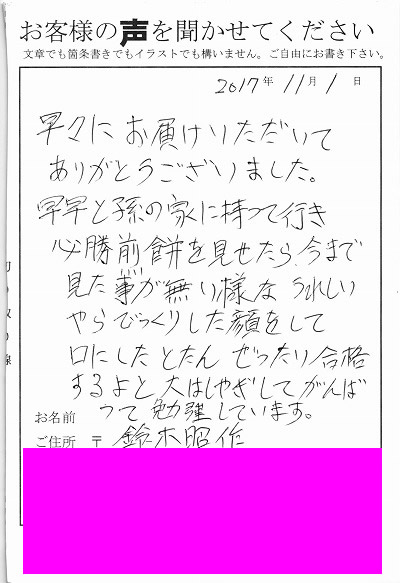 早々にお届けいただいてありがとうございました。早早と孫の家に持って行き必勝煎餅を見せたら今まで見たことがない様なうれしいやらでびっくりした顔をして口にしたとたんぜったい合格するよと大はしゃぎしてがんばって勉強しています。