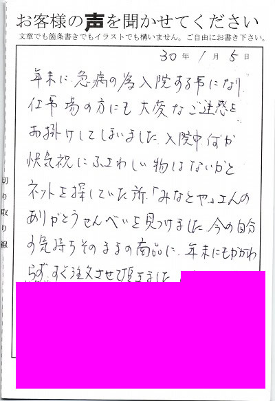 年末に急病の為入院する事になり仕事場の方にも大変なご迷惑をお掛けしてしまいました。入院中は何か快気祝いにふさわしい物はないかとネットを探していた所、みなとやさんのありがとうせんべいを見つけました。今の自分の気持ちをそのまま商品に年末にもかかわらずすぐ注文させて頂きました。