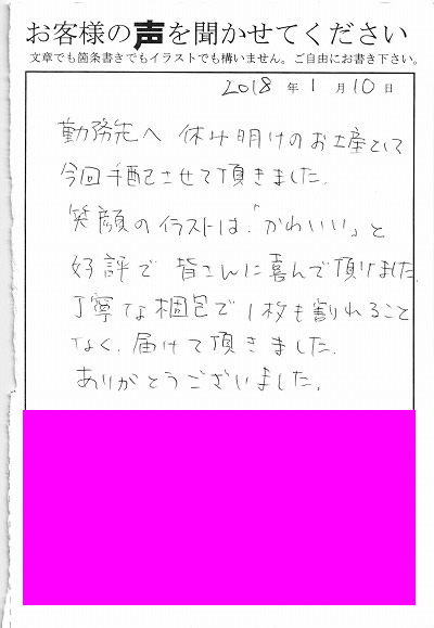勤務先は休み明けのお土産として今回手配させて頂きました。笑顔のイラストは「かわいい」と好評で皆さんに喜んで頂けました。丁寧な梱包で1枚も割れることなく届けて頂きました。ありがとうございました。