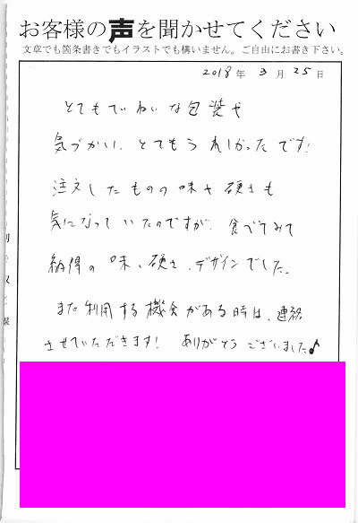 とてもていねいな包装や気づかい、とてもうれしかったです。注文したものの味や硬さも気になっていたのですが、食べてみて納得の味、硬さ、デザインでした。また利用する機会がある時は連絡させていただきます!ありがとうございました。