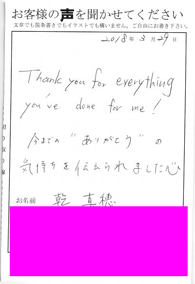 Thanky you for everything you’ve done for me!今までのありがとうの気持ちを伝えられました。