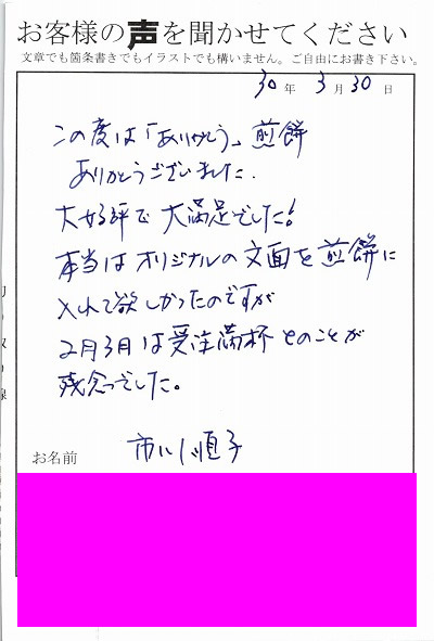 この度は「ありがとう」煎餅ありがとうございました。大好評で大満足でした!本当はオリジナルの文面を煎餅に入れて欲しかったのですが2月3日に受注満杯とのことが残念でした。