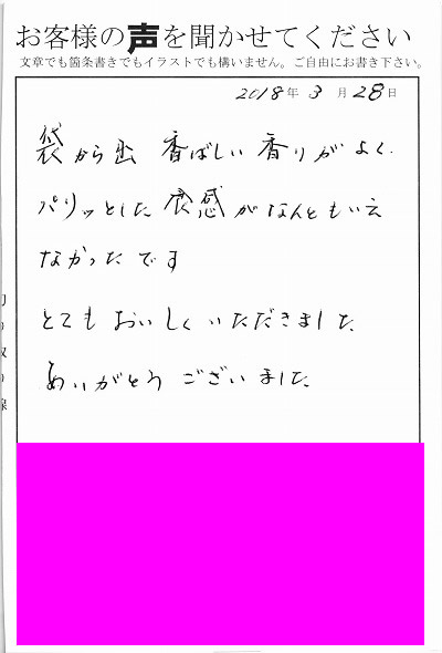 袋から出 香ばしい香りがよく、パリッとした食感がなんともいえなかったです。とてもおいしくいただきました。ありがとうございました。