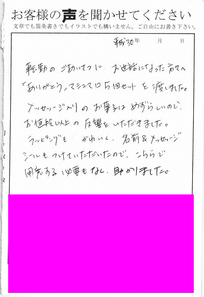 転勤のごあいさつにお世話になった方々へ「ありがとう」マシュマロ5個セットを渡しました。メッセージ入りのお菓子はめずらしいいので、お値段以上の反響をいただきました。ラッピングもかわいく、名前&メッセージシールもつけていただいたので、こちらで用意する必要もなく助かりました。