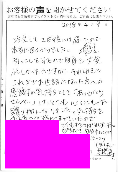 その他の事例・商品のお客様の声 93 『「ありがとうせんべい」はとても心のこもった贈り物になりました』