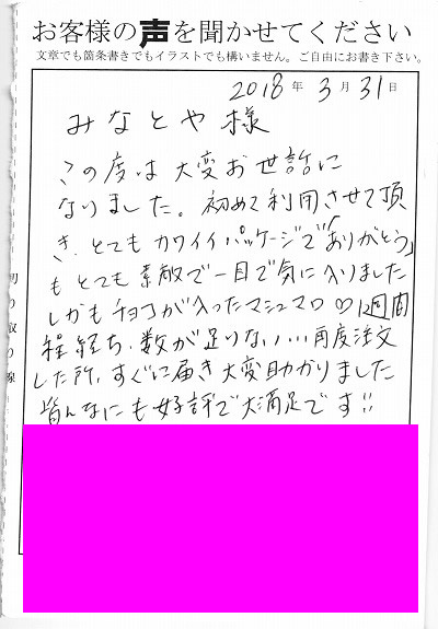 この度は大変お世話になりました。初めて利用させて頂き、とてもカワイイパッケージで「ありがとう」もとても素敵で一目で気に入りました。しかもチョコが入ったマシュマロ。1周間ほど経ち、数が足りない。サイド注文したところ、すぐに届き、大変助かりました。皆にも好評で大満足です!!
